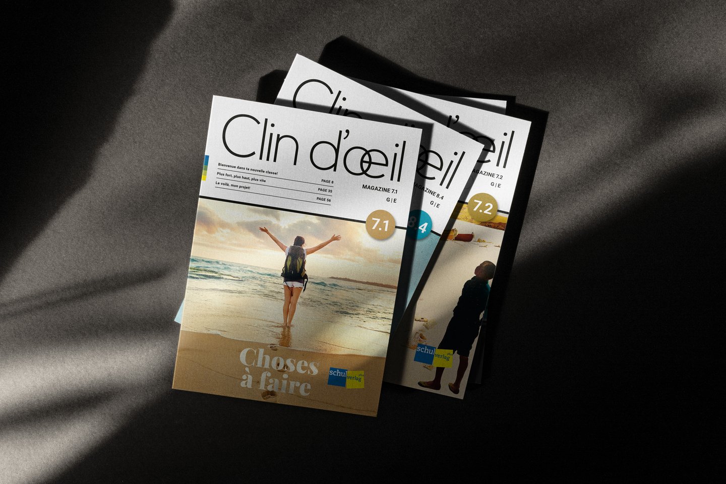 Für alle Clin d’œils liefern wir das neue Design und die Umsetzung der vom Autor:innen-Team gelieferten Manuskripte im neuen Layout. Bei uns laufen die Fäden zusammen und wir führen in enger Zusammenarbeit mit dem Schulverlag und den Autor:innen mehrere Korrekturrunden durch, bis am Ende jedes Detail stimmt.