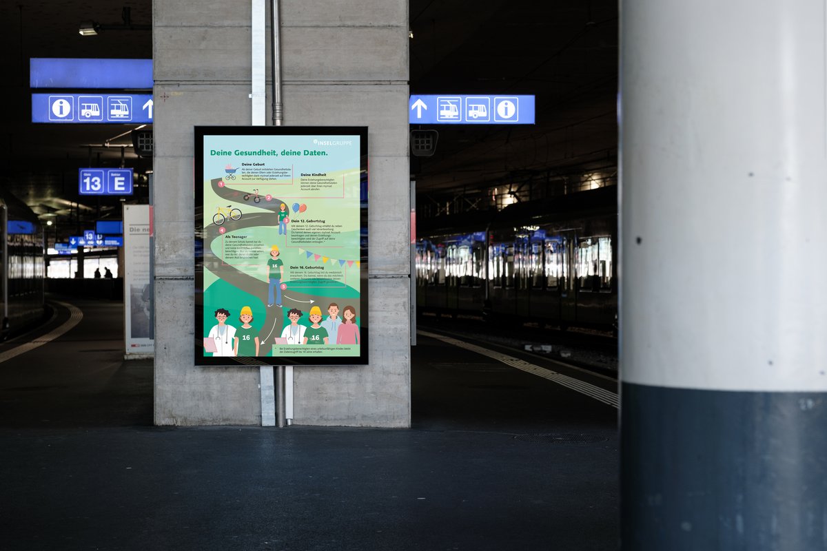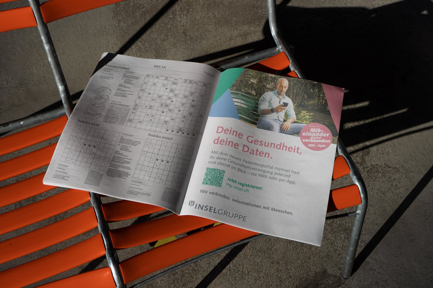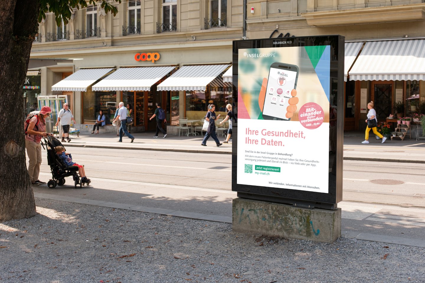 Die Kernaussage «Deine Gesundheit, deine Daten» wurde auf Plakten und Digitalen Signages an strategischen Punkten auf dem Weg zwischen Bahnhof Bern und Inselspital platziert. So sprechen die Werbemittel (potenzielle) Patient:innen dort an, wo sie nah am Thema sind. Darüber hinaus wurde myInsel via Inserate und Werbebanner bekannt gemacht.